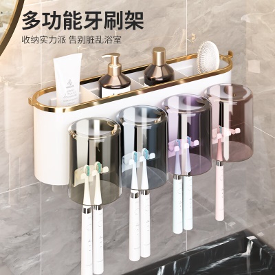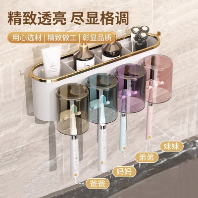 囍器牙刷置物架牙刷架漱口杯免打孔壁挂式电动牙刷架卫生间置物架 多功能牙刷架【四口之家】带杯子