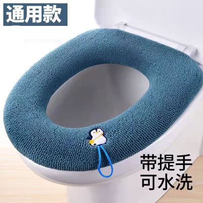 加厚马桶坐垫针织马桶坐垫家用冬季纯色马桶坐便器圈垫可水洗坐便套垫圈 青色企鹅带提手