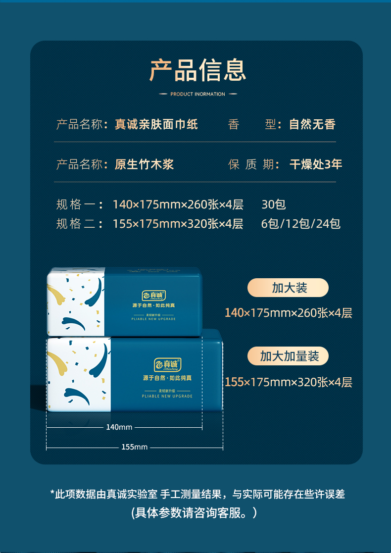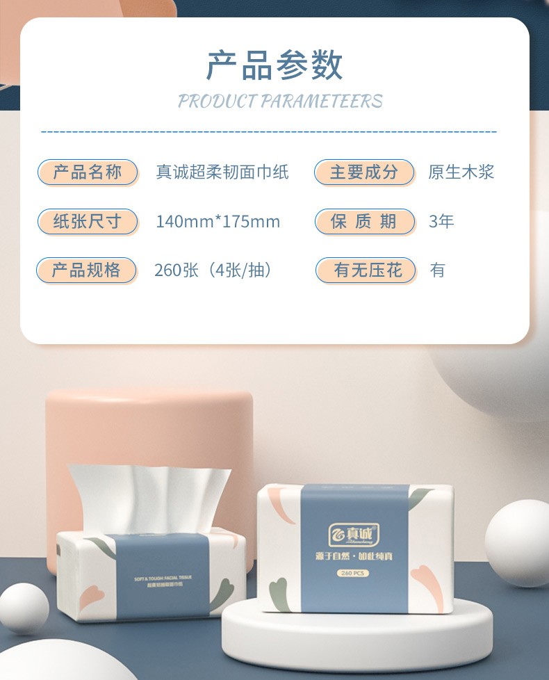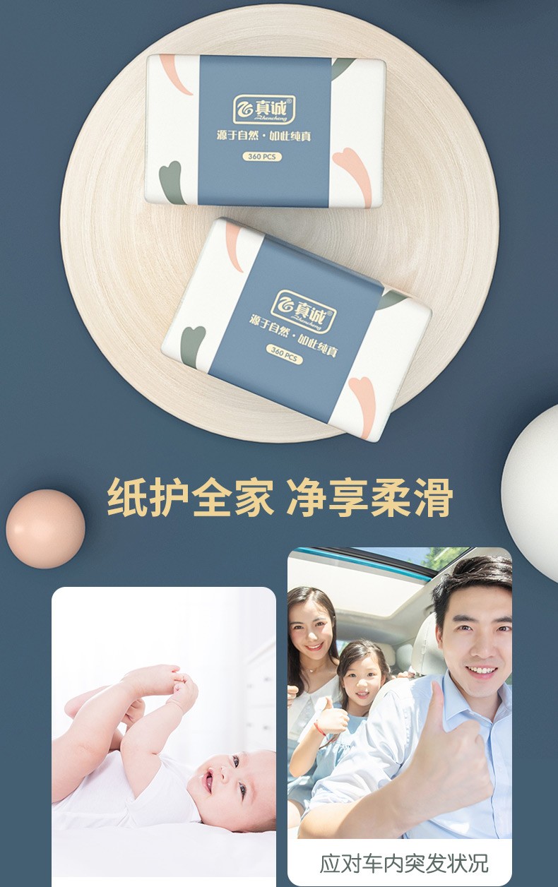 商品名称:【大包装】真诚原木抽纸4层餐巾纸家用卫生纸母婴用纸商用纸巾 30包【175*140mm*260张】