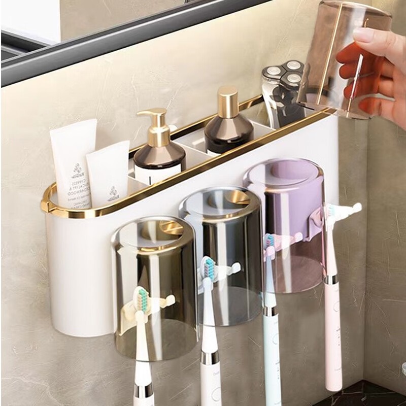 囍器牙刷置物架牙刷架漱口杯免打孔壁挂式电动牙刷架卫生间置物架 多功能牙刷架【四口之家】带杯子