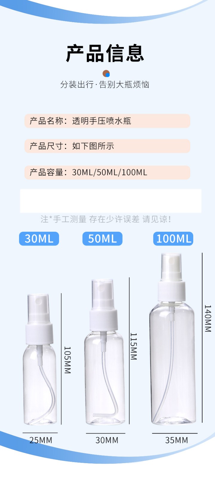 商品名称:赫孜酒精迷你喷瓶消毒喷雾瓶分装瓶细雾小喷瓶喷水喷雾器补水喷壶 透明色 5个装50毫升