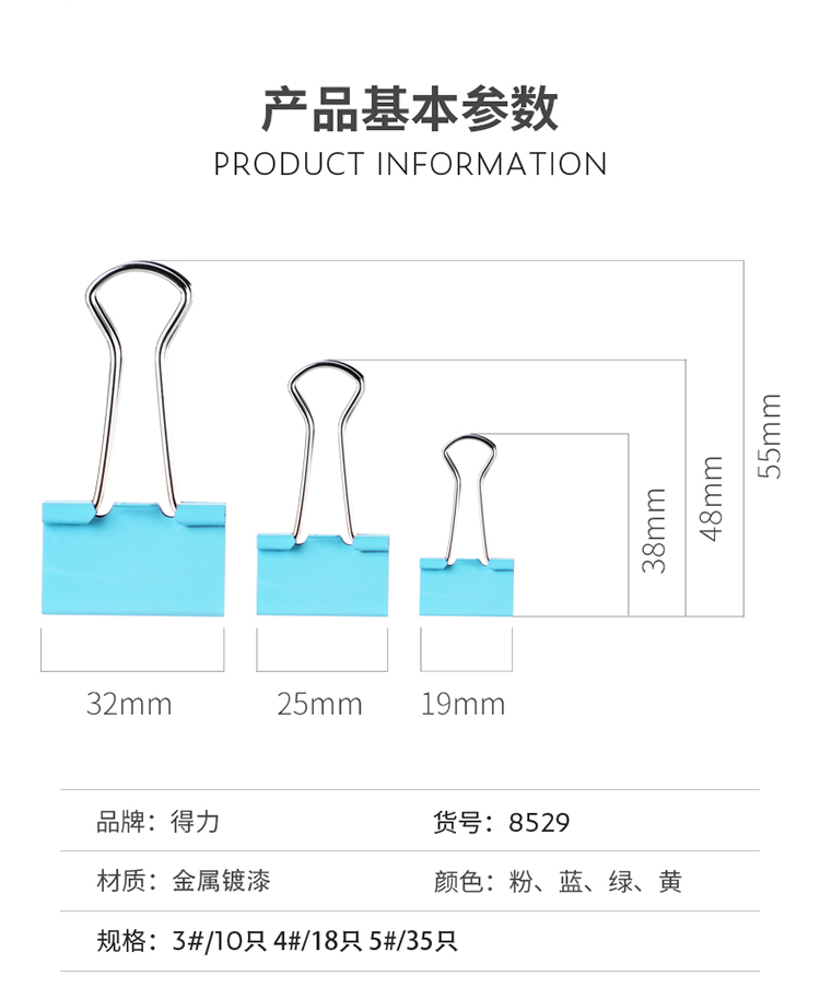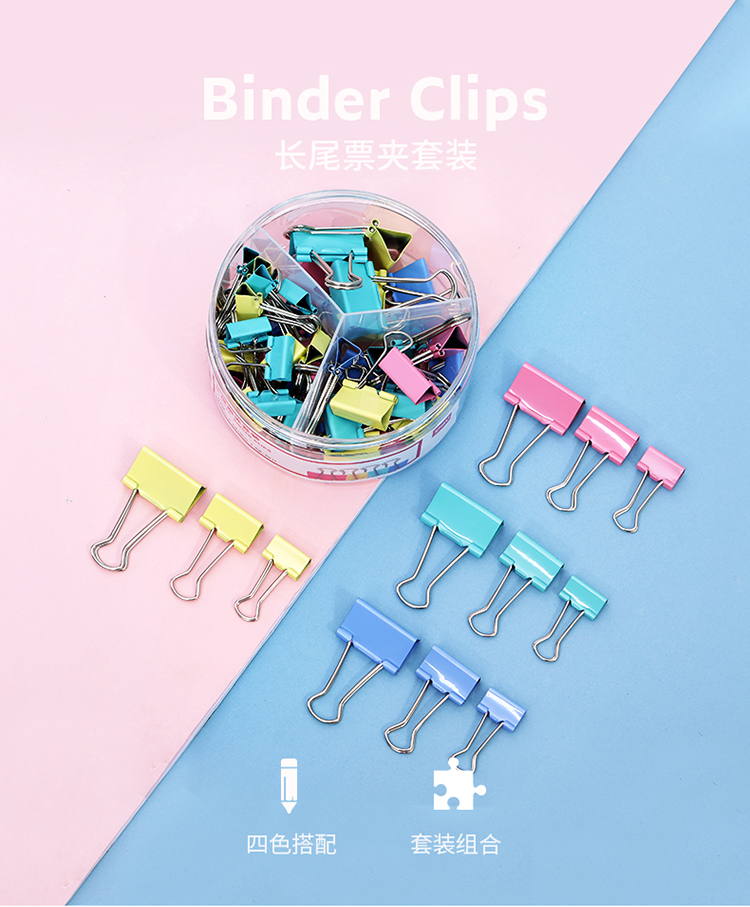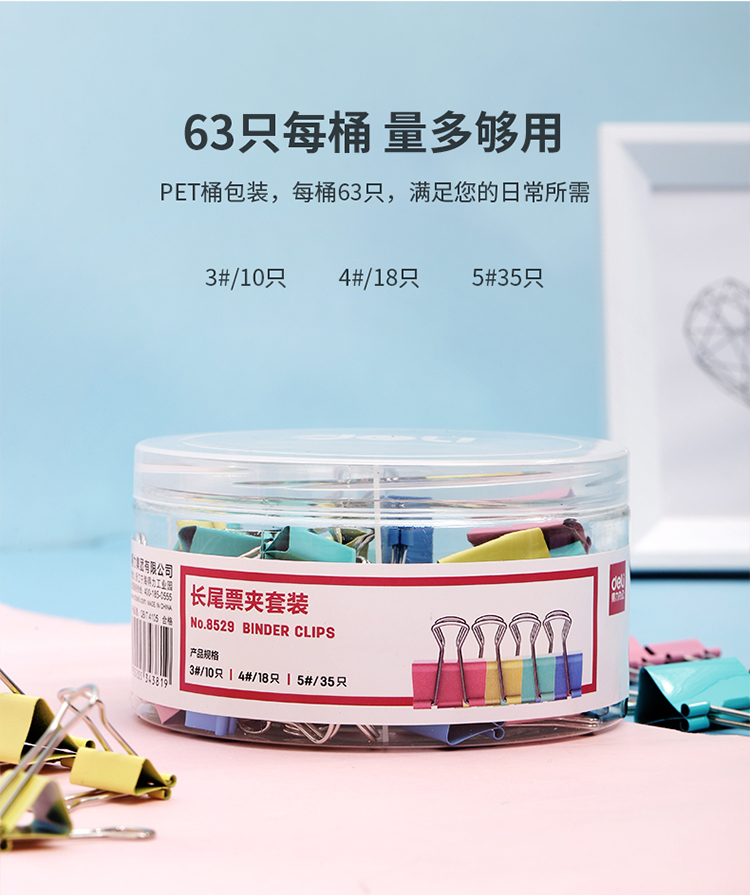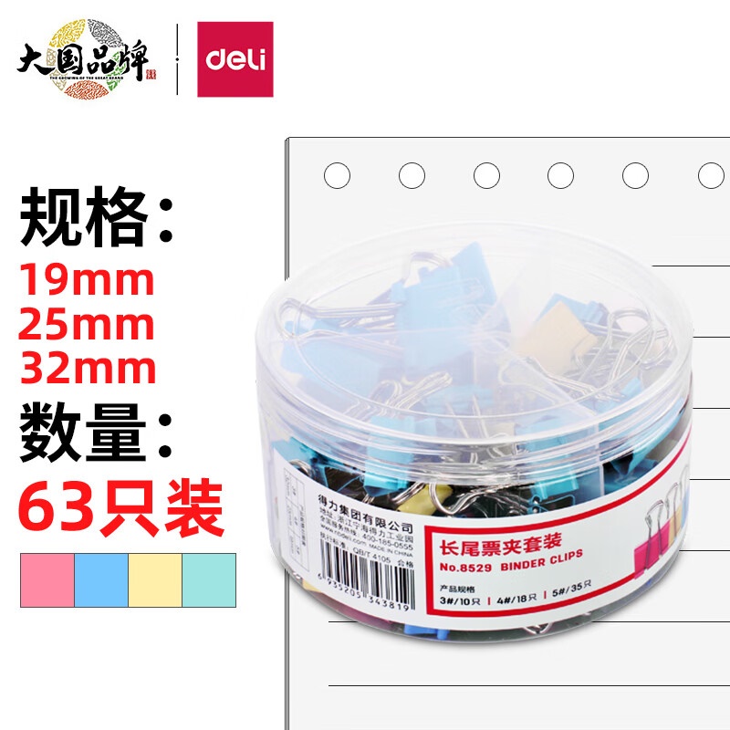 商品名称:得力(deli)63只多规格票夹套装 彩色长尾夹/燕尾夹 中号+小号(32mm10只+25mm18只+19mm35只) 办公用品 8529