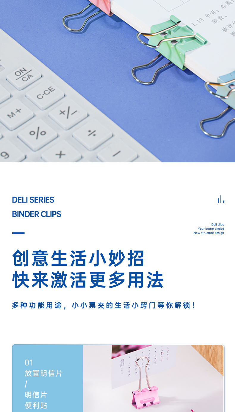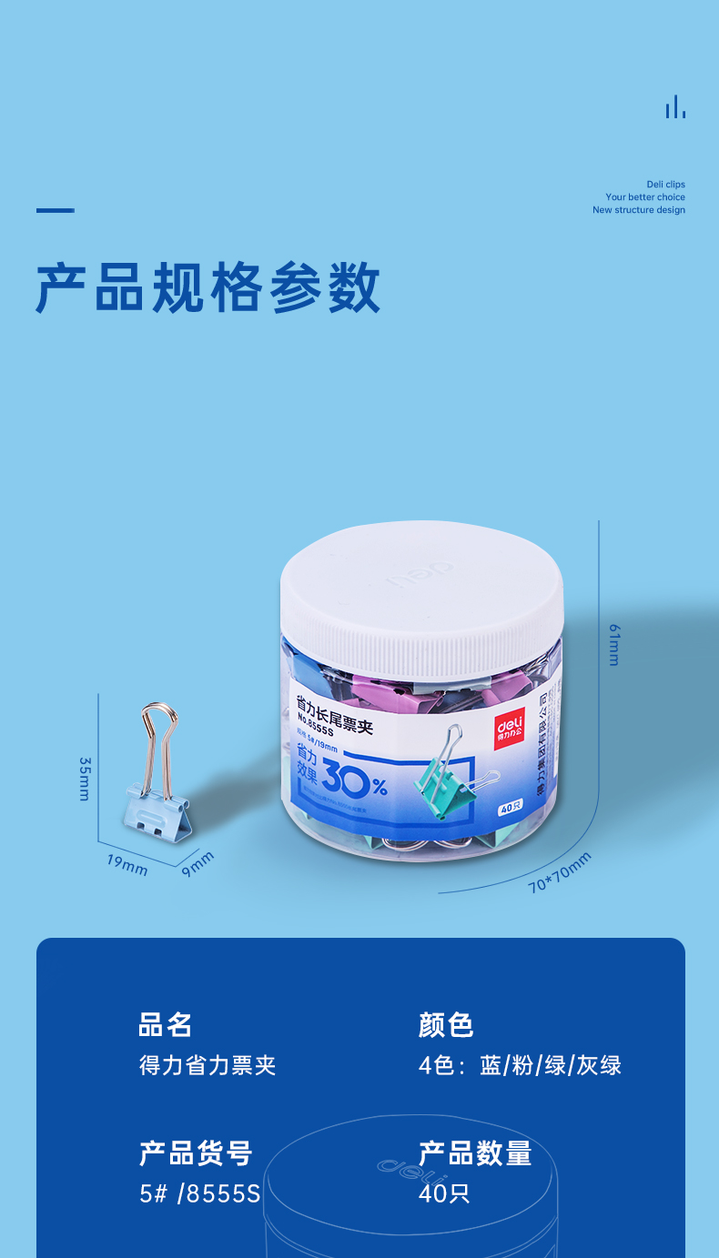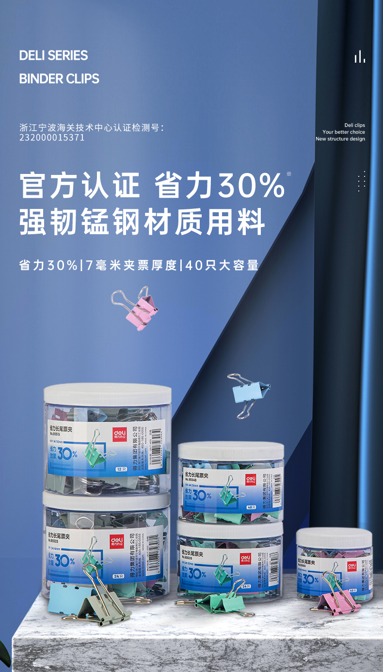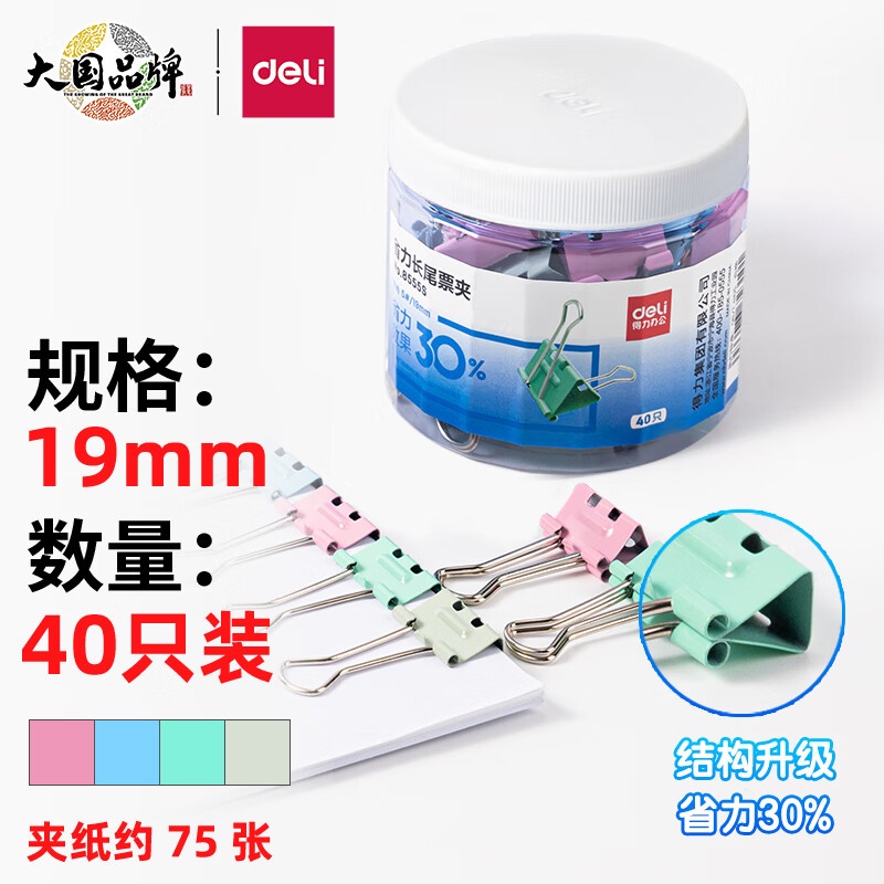 商品名称:得力(deli)40只19mm省力彩色长尾夹票夹 5#金属燕尾夹票据夹子 办公用品 8555S