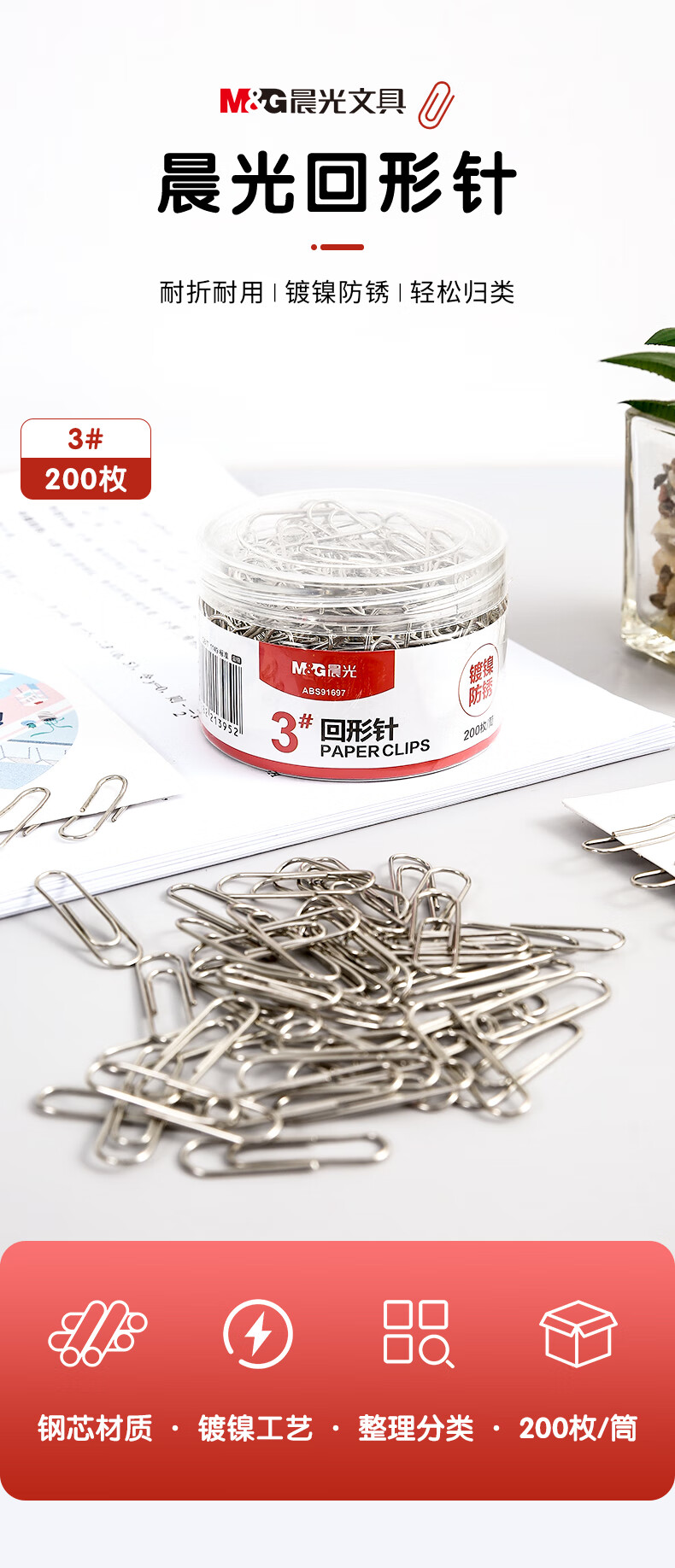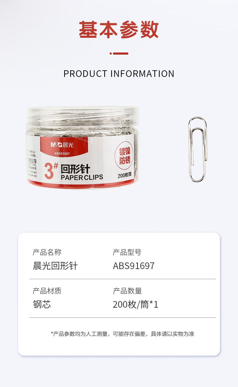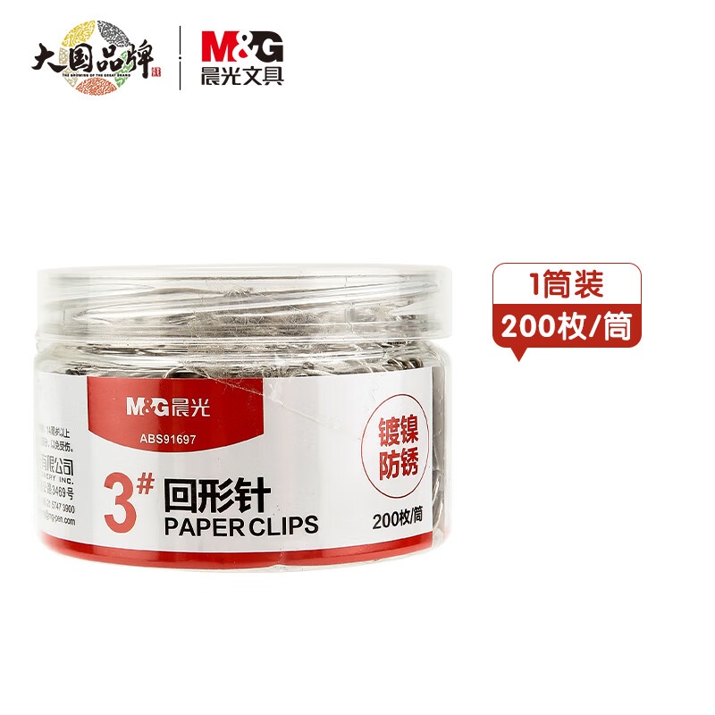 商品名称:晨光(M&G)文具3#镀镍回形针 金属防锈曲别针 办公用品 200枚/盒ABS91697