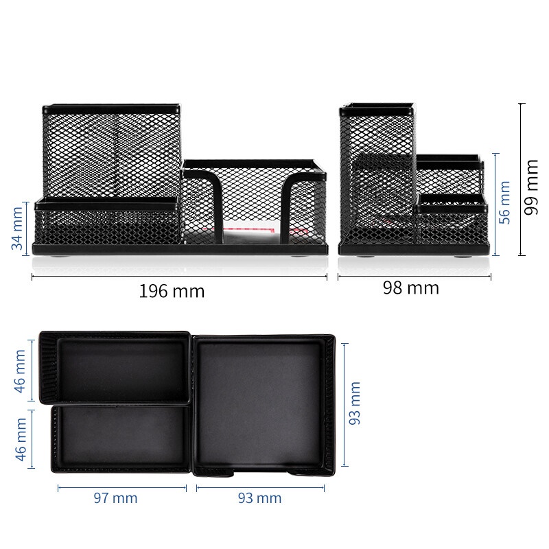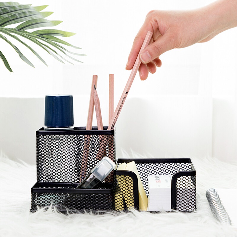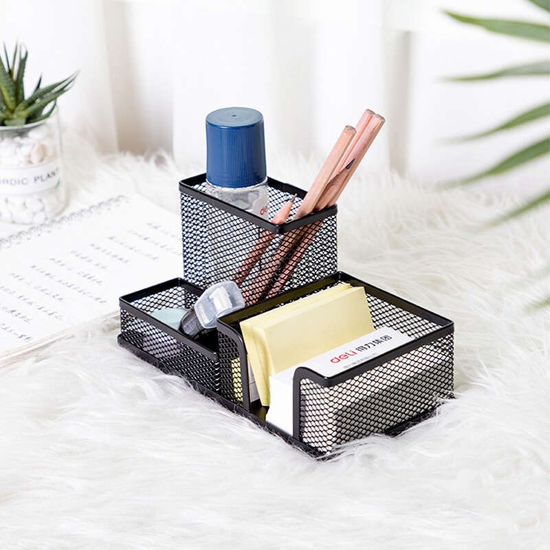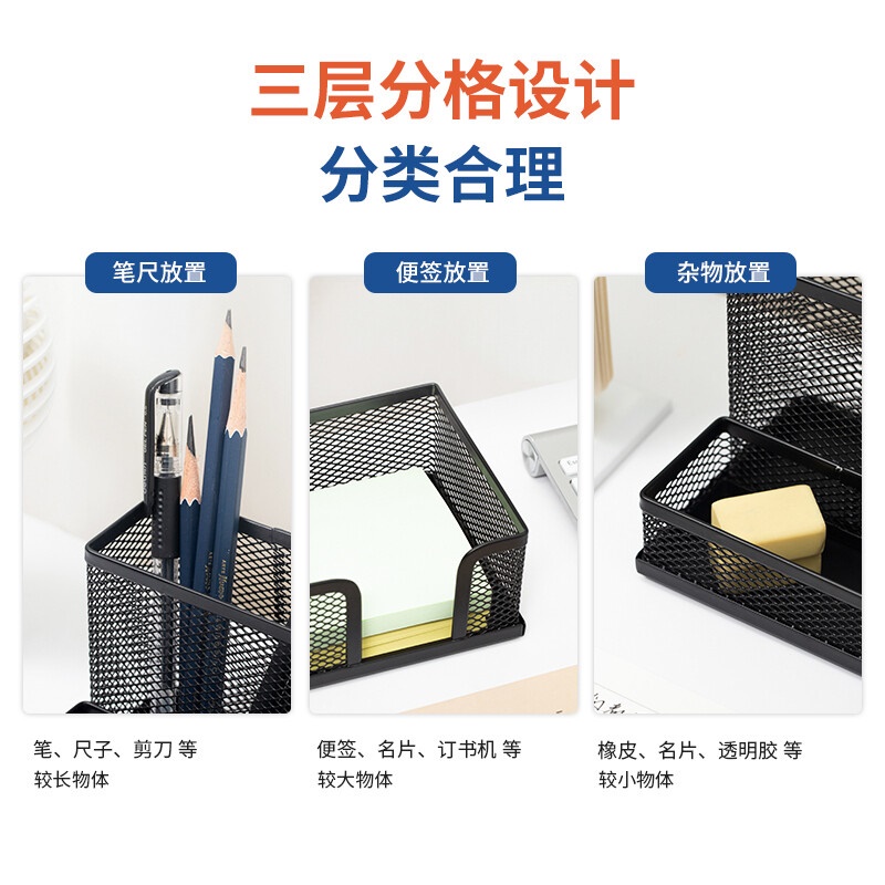 商品名称:得力(deli)金属网纹笔筒 多功能三格桌面收纳 办公用品 黑色9175