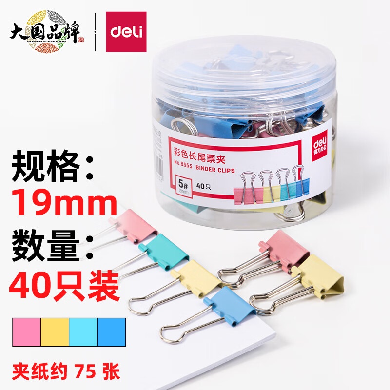 商品名称:得力(deli)40只19mm彩色长尾夹票夹 5#小号金属燕尾夹票据文件夹子 办公用品 8555
