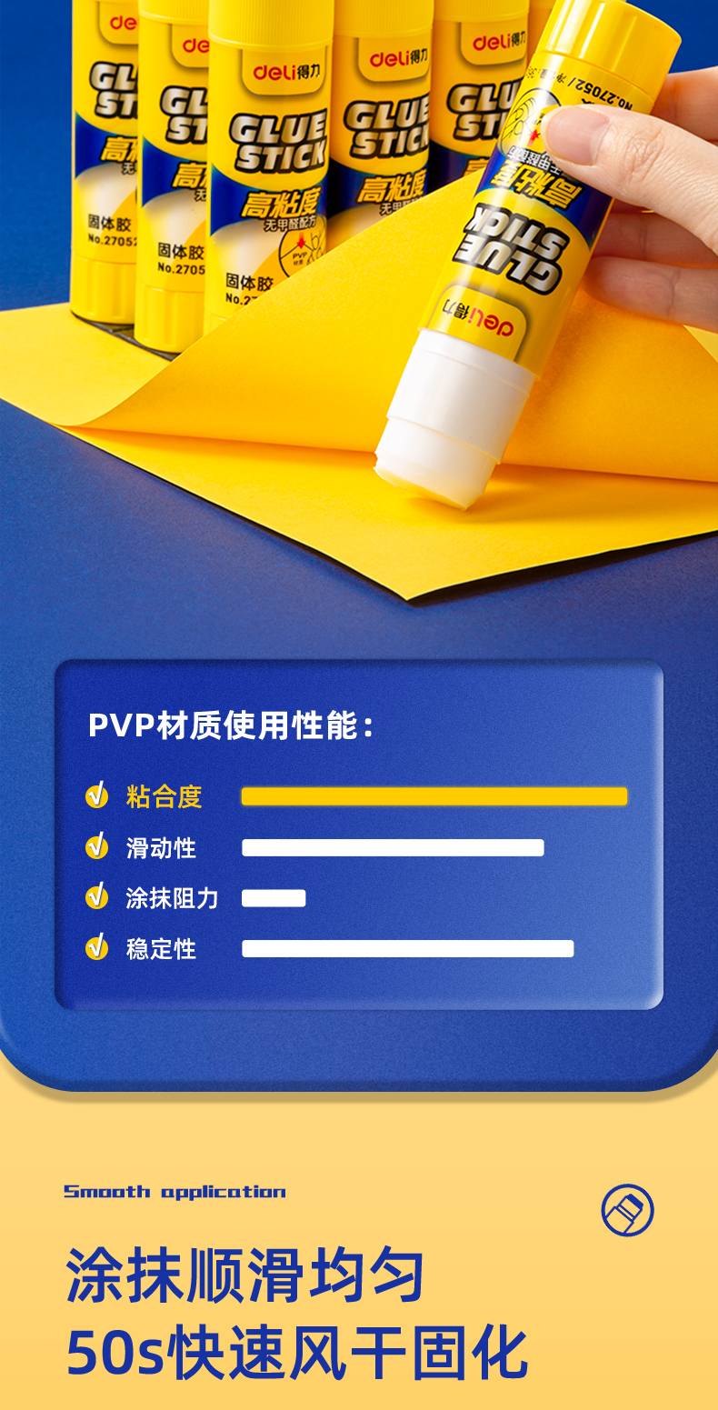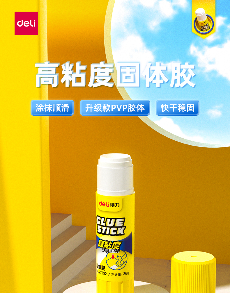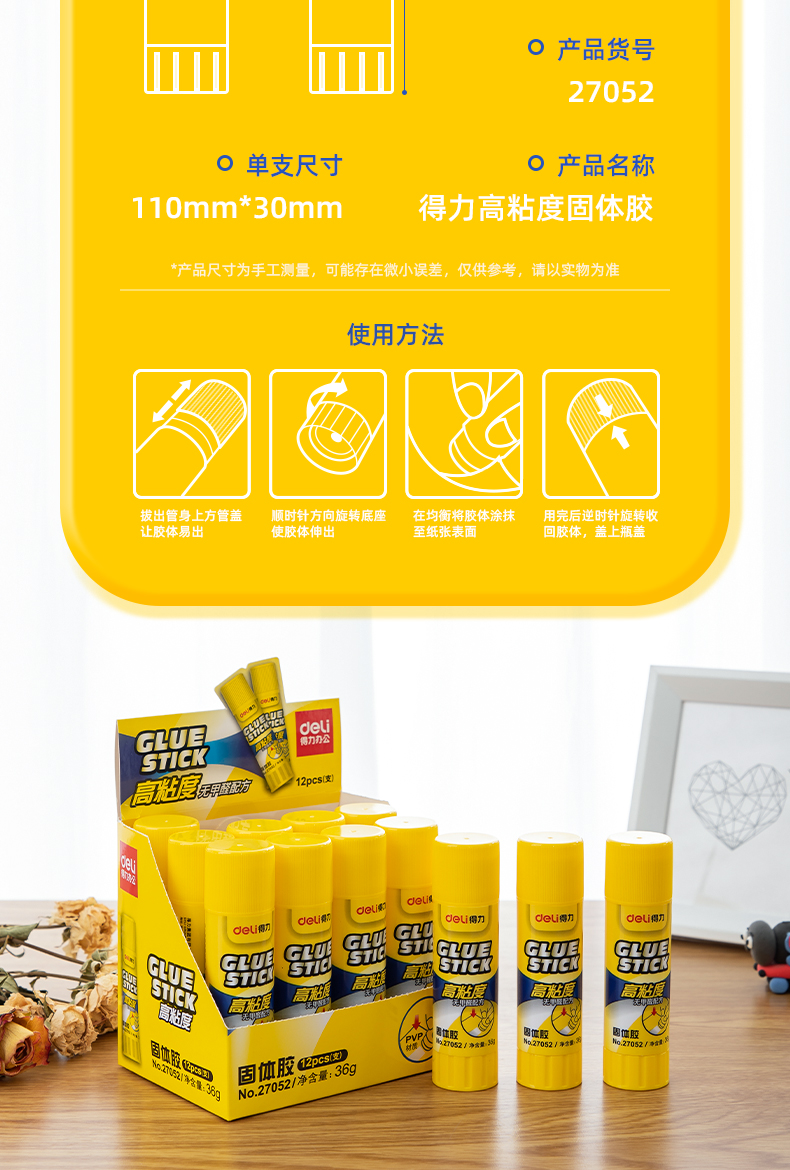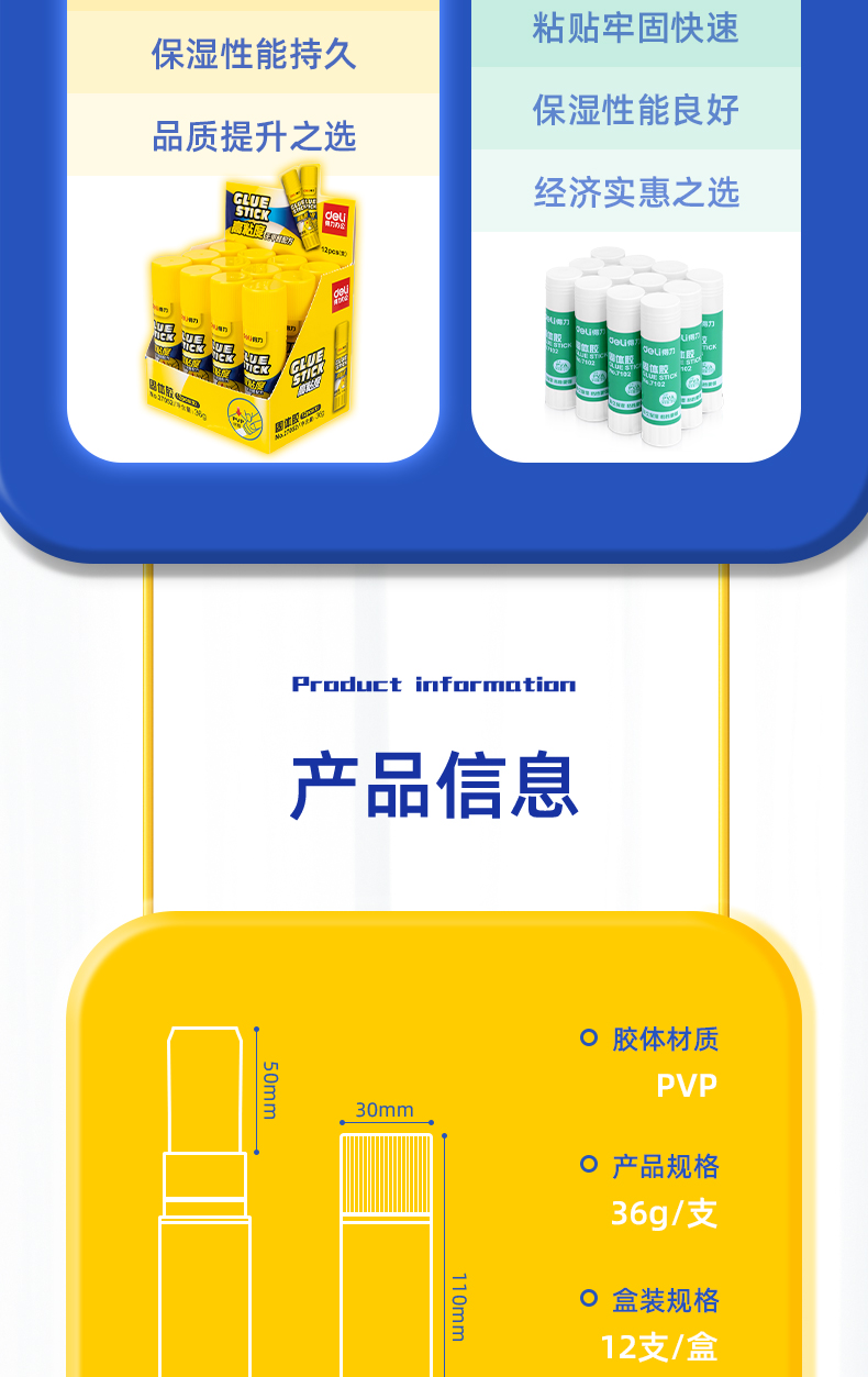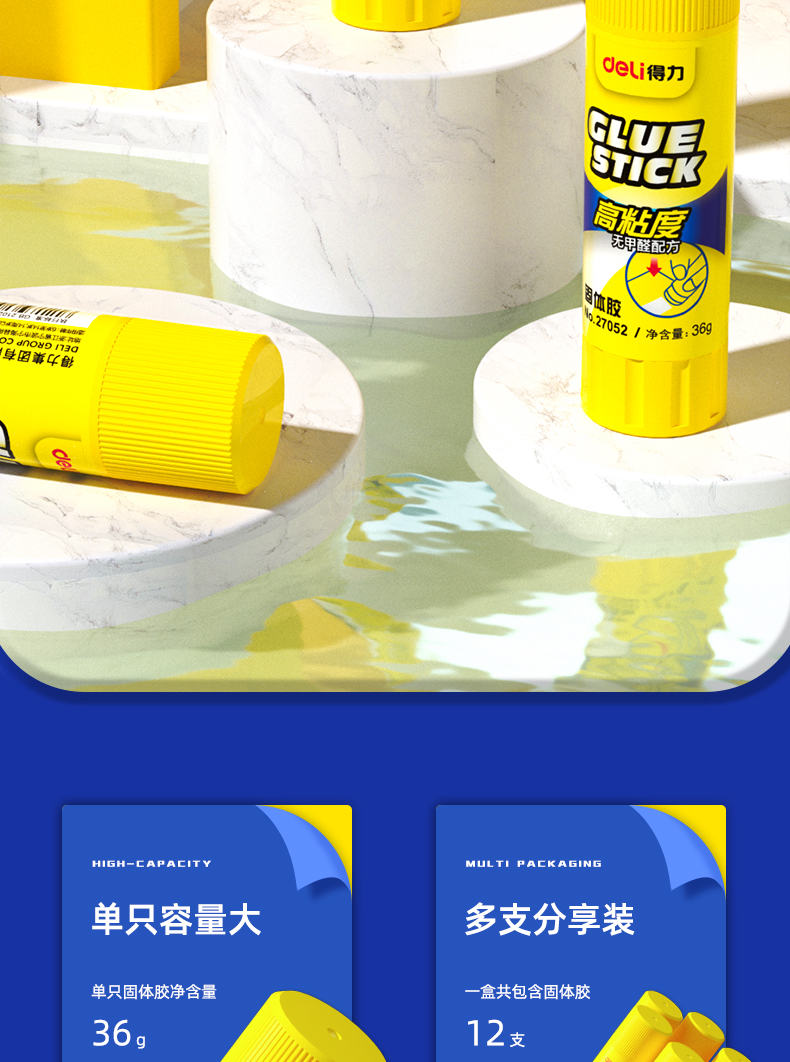 商品名称:得力(deli)36g高粘度PVP固体胶水 无甲醛快干耐用胶棒 12支装 办公用品 27052