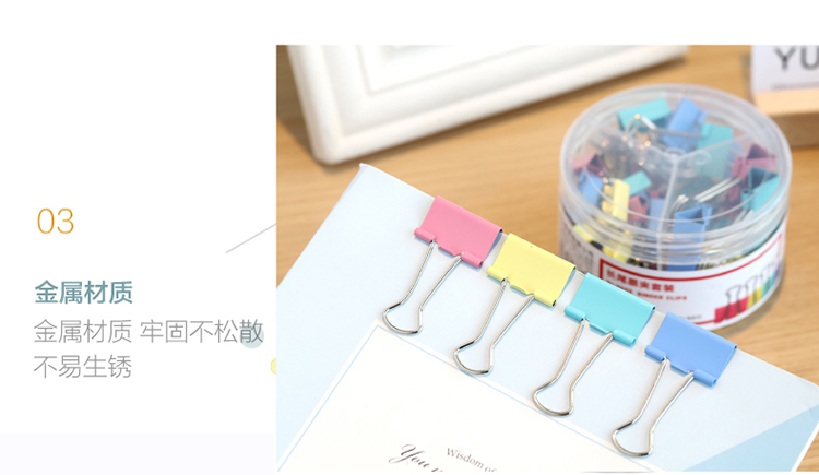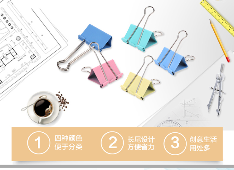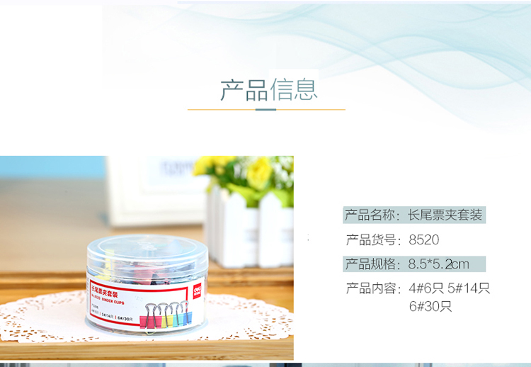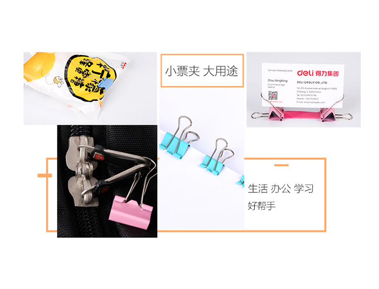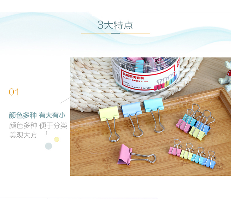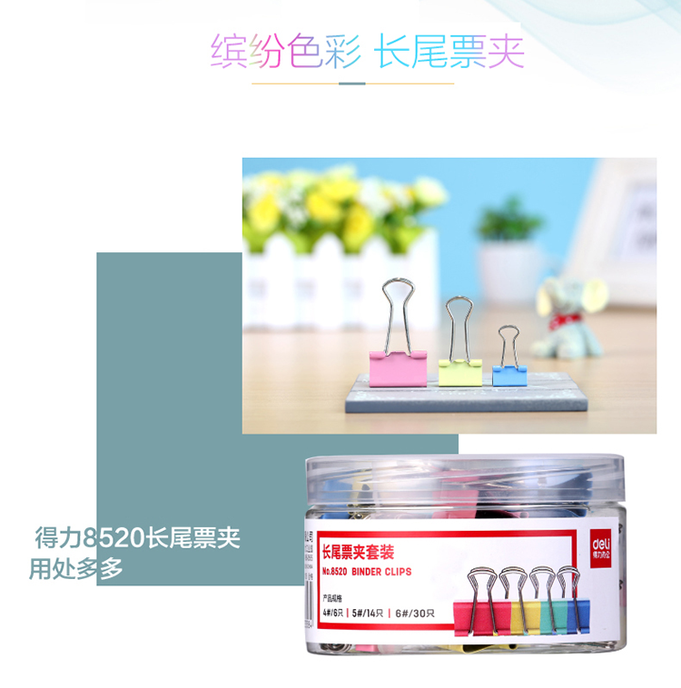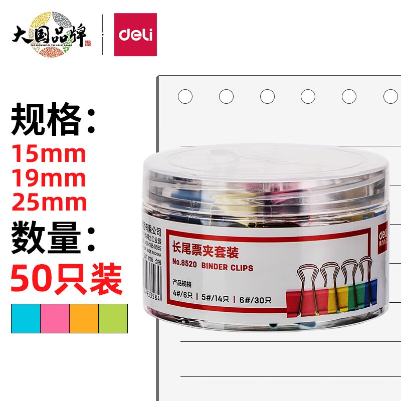 商品名称:得力(deli)50只多规格票夹套装 彩色长尾夹/燕尾夹 中号+小号(25mm6只+19mm14只+15mm30只) 办公用品 8520