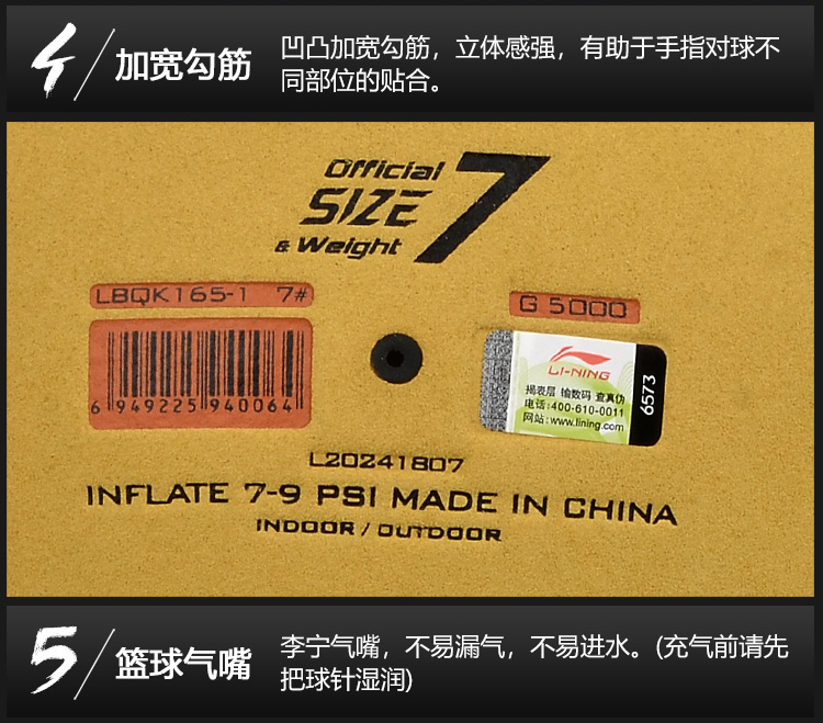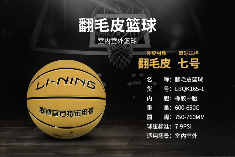 商品名称:李宁(LI-NING)篮球比赛用球翻毛皮蓝球室内外通用比赛7号PU材质篮球 LBQK165-1