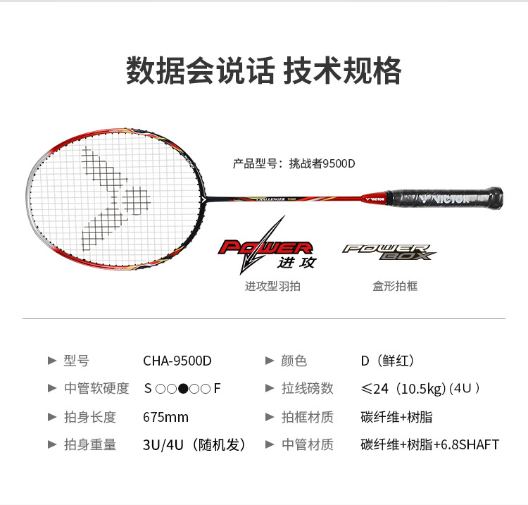 商品名称:威克多VICTOR胜利羽毛球拍单拍全碳素进攻型经典CHA-9500D红色4U穿线
