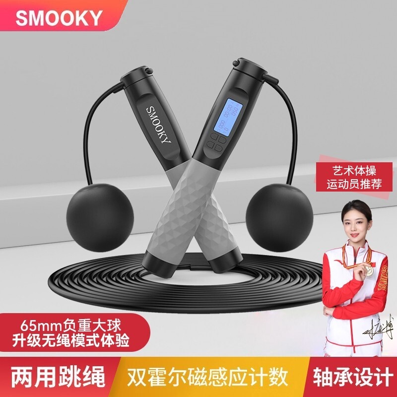 SMOOKY 专业计数成人跳绳无绳钢丝轴承防绕绳健身器材运动体育训练用品中考跳绳中考智能跳绳儿童跳绳 【有绳+无绳大球+负重】计数黑灰豪华款